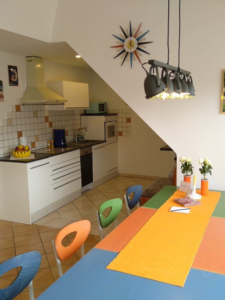 Sehr helle, modern und bunt eingerichtete großzügige Dachgeschosswohnung mit großem Wohn- und Esszimmer mit offener Küche und direktem Zugang zum Balkon mit Weitblick.
